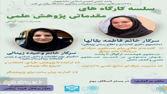 سلسله کارگاههای مقدماتی پژوهش علمی با همکاری معاونت تحقیقات و فناوری دانشگاه و همت انجمن اسلامی ۱۳۴۸ در بازه زمانی ۱۹ مرداد تا ۹ شهریور ۱۴۰۴ بهصورت آنلاین از طریق سامانه اسکایروم برگزار گردید. این کارگاهها با هدف ارتقای مهارتهای پایه پژوهشی دانشجویان و پژوهشگران طراحی و اجرا شد و شامل ۵ موضوع آموزشی به شرح زیر بود: